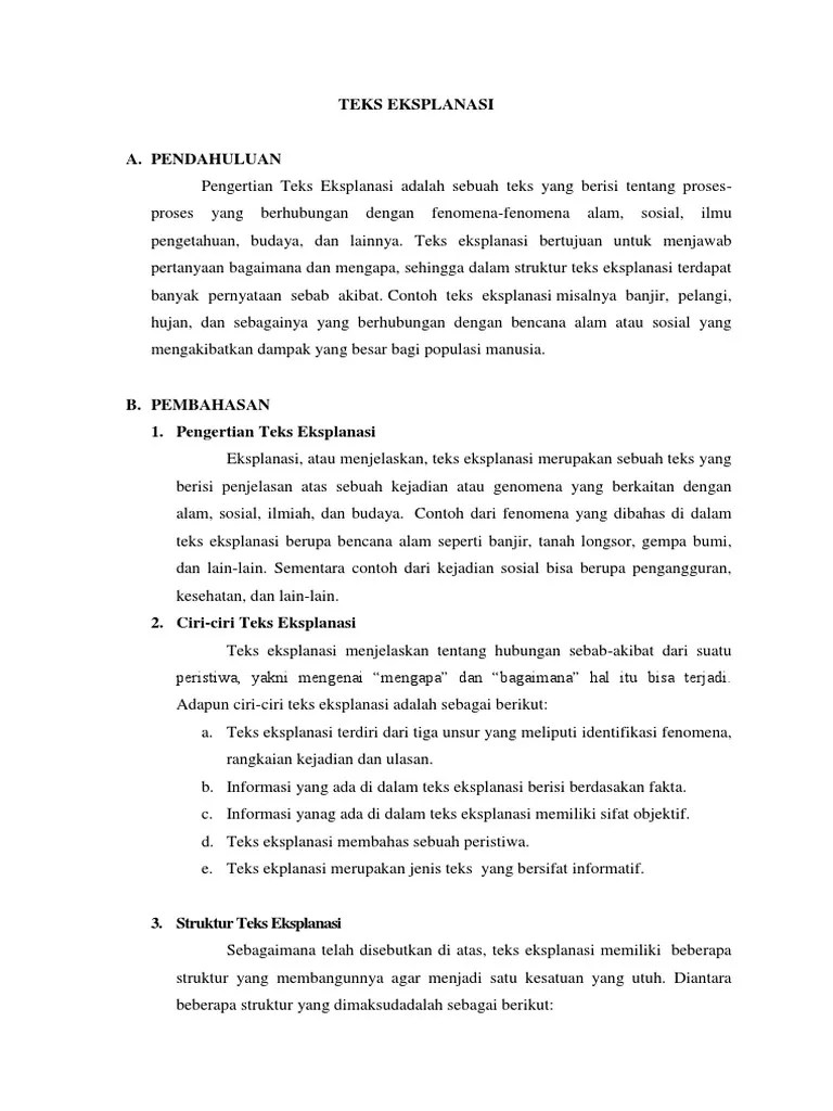 Banjir termasuk dalam salah satu gejala alam yang mempengaruhi kehidupan manusia dan dapat menimbulkan kerusakan. 3.4 menganalisis struktur dan kebahasaan teks eksplanasi. Letusan gunung berapi menjadi salah satu bencana alam yang luar . Deretan penjelas mendeskripsikan dan merincikan penyebab dan akibat dari sebuah bencana alam yang terjadi. Banjir merupakan peristiwa bencana alam yang dampaknya meliputi kerusakan fisik, moril dan materil.